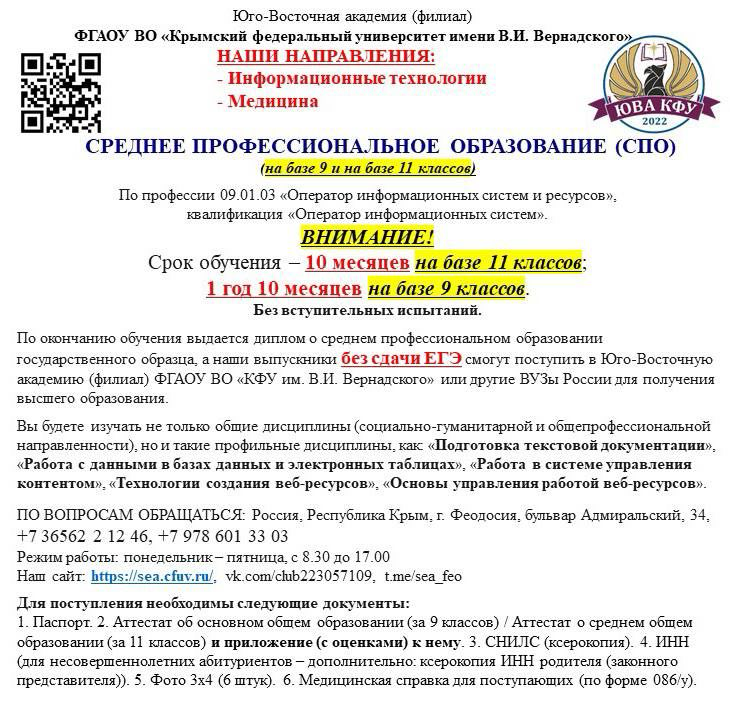 Юго-Восточная академия (филиал) ФГАОУ ВО «Крымский федеральный университет имени В.И. Вернадского» ИНФОРМИРУЕТ ПОСТУПАЮЩИХ(https://sea.cfuv.ru/incoming/).