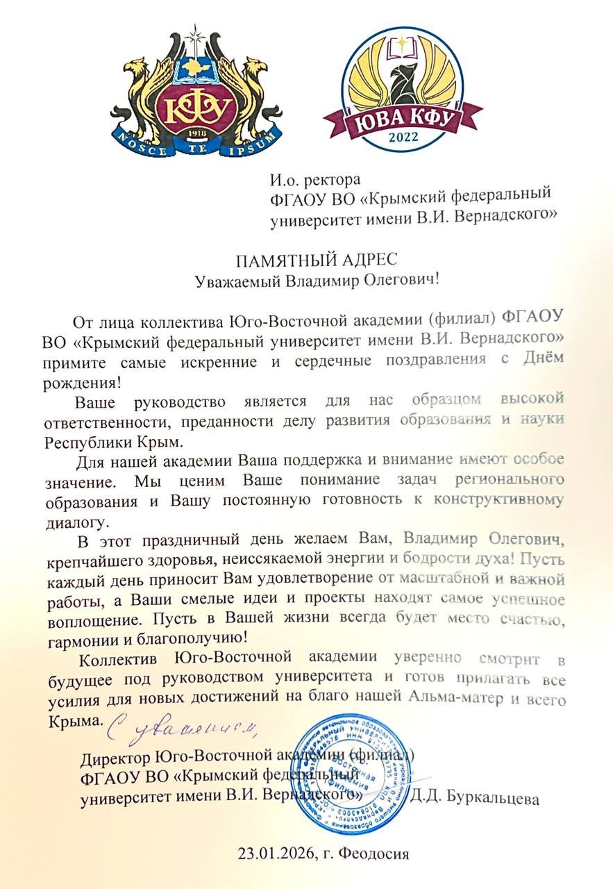 От лица коллектива Юго-Восточной академии (филиал) ФГАОУ ВО «Крымский федеральный университет имени В.И. Вернадского» примите самые искренние и сердечные поздравления с Днём рождения!